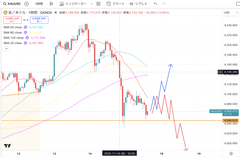 赤矢印のように反転上昇できなく、再度下落するパターンになるのか?